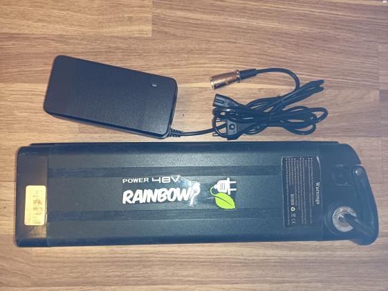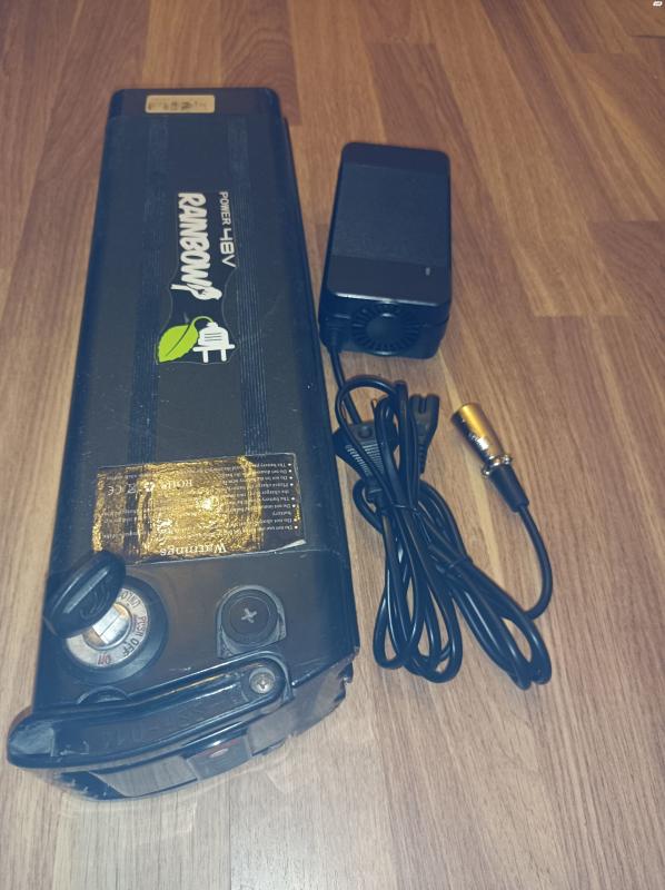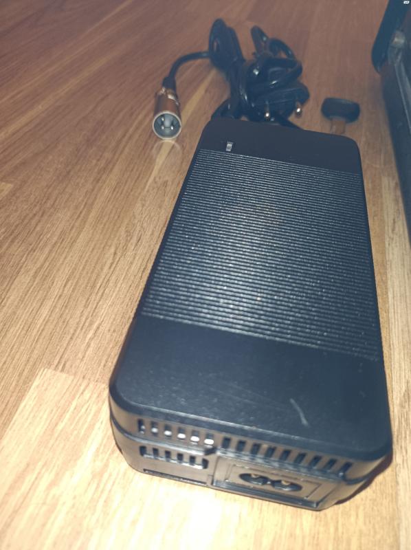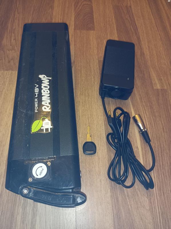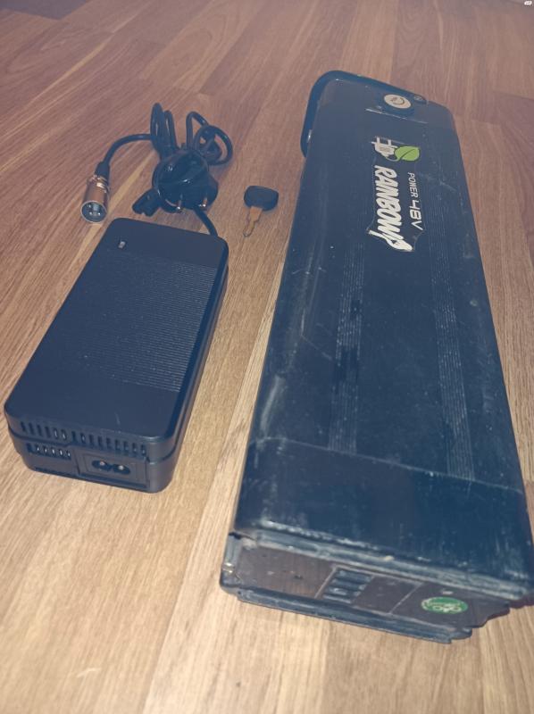 סוללה לאופניים חשמליים. הספק 11 אמפר שעה, 48 וולט. כולל מפתח. בנוסף מטען 48 וולט. הספק 3 אמפר, מטח 54.6 וולט. חיבור XLR. דגם איכותי הכולל מאוורר. חדש מהאריזה! סוללה 48V, 11 ומטען 54.6V, 3A.
