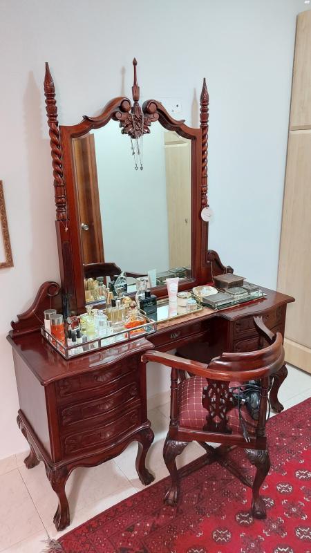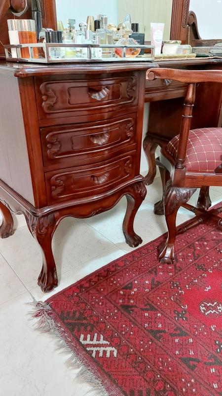 מיטת אפיריון עתיקה מעץ מהגוני כולל המזרן, בתוספת שידת איפור עתיקה מעץ מהגוני עם מראה וכיסא מעץ מהגוני תואם. כל הרהיטים מיוצרים בעבודת יד , ניתן לבקש תמונות נוספות של כל חלק כדי להתרשם מהייחוד של העבודה חדר שינה עתיק מעץ מהגוני