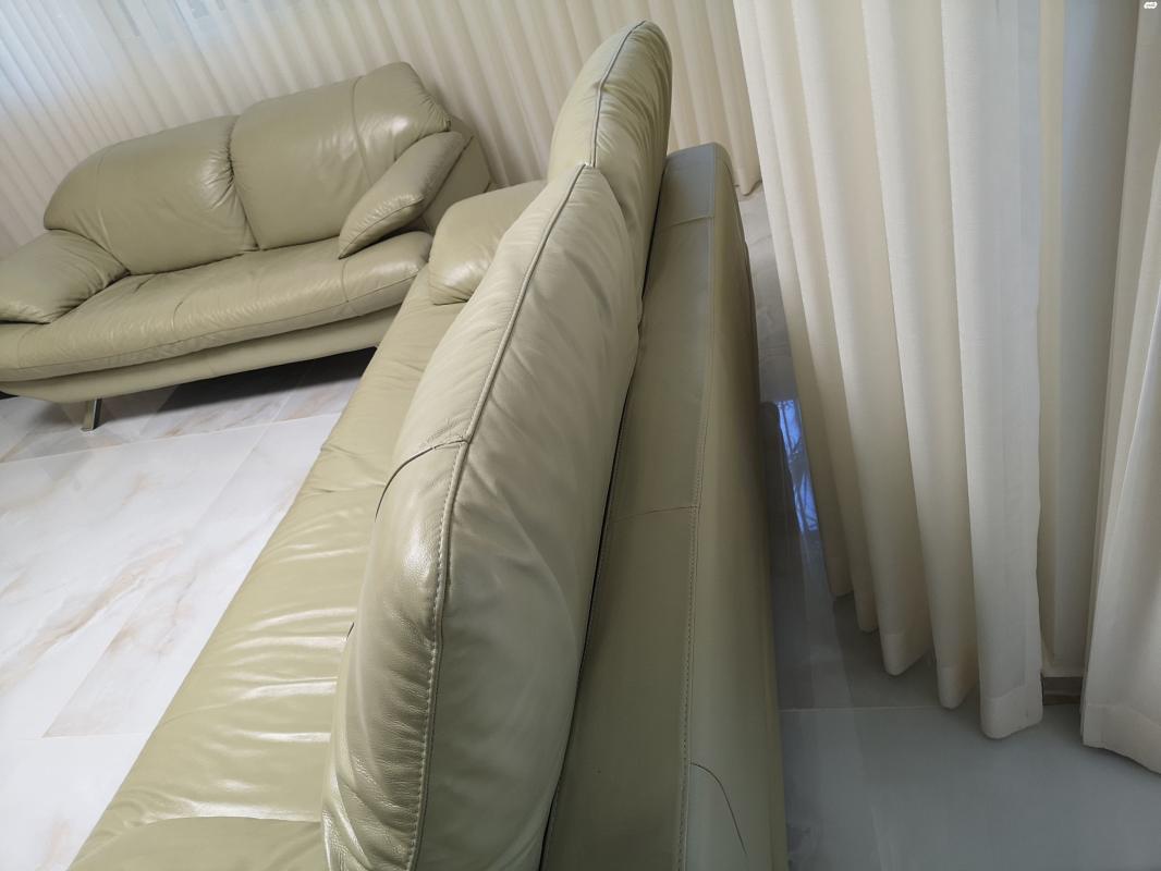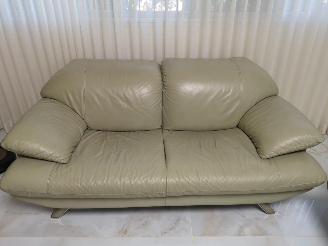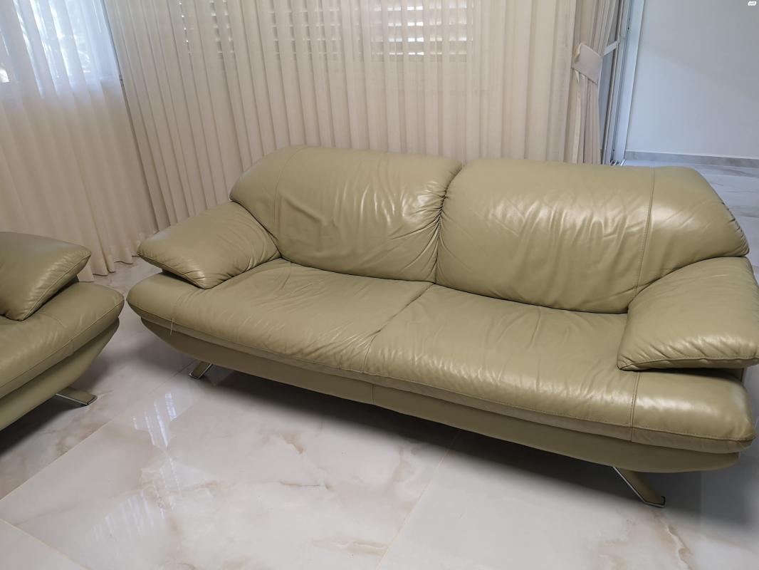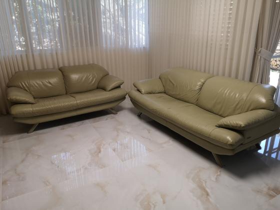 סלון עור יוקרתי של ניקולטי, ספה דו ותלת מושבית, צבע ירוק בהיר, עם רגליות ניקל משולבות עור, עור גם מהצד האחורי של הספות. לספות ריקליינרים להתאמת תנוחת ראש נוחה. במצב שמור מאד, מחיר גמיש לרציניים סלון עור של ניקולטי