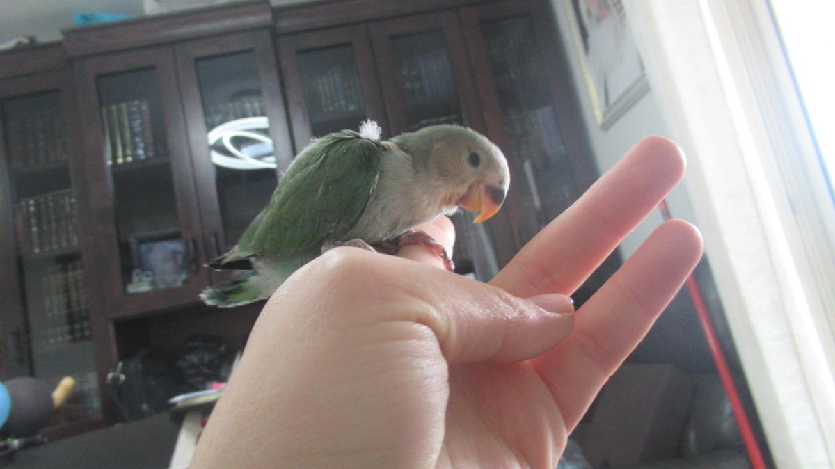 גוזל של ציפורי אהבה האכלת יד בן חודשיים וחצי חמוד אוכל עדיין ממזרק מטופל היטב , מאולף ברמה גבוהה