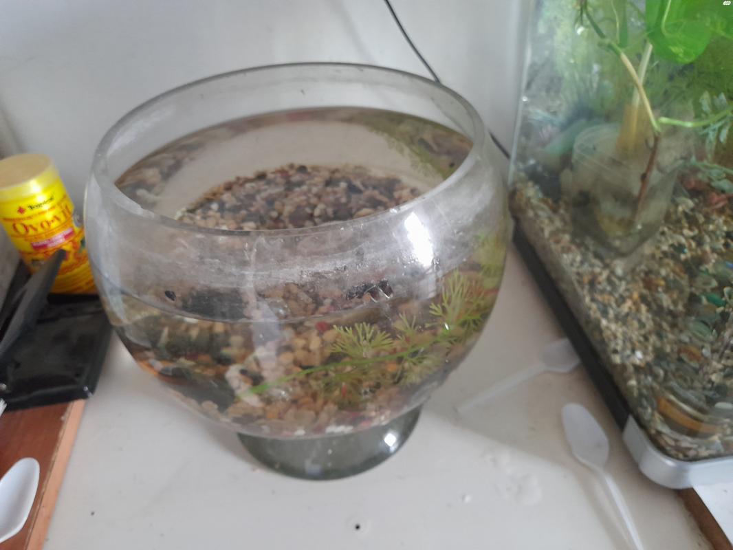 אקווריון זכוכית עגול (קוטר 25 ס"מ) כולל חצץ וצמח פלסטי .מתאים לדגי קרב או דגי זהב