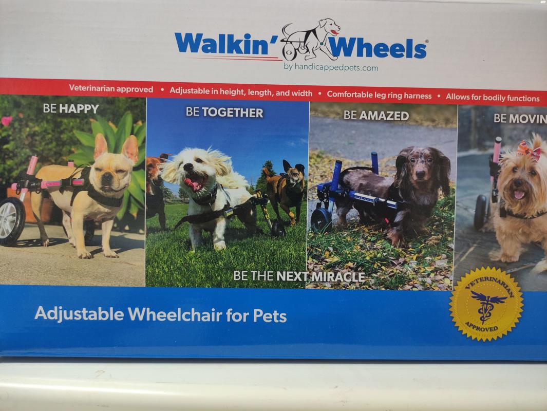 כיסא גלגלים לכלב/ה נכה, מתאים עד לגודל של 13 ק"ג. מסייע בהליכה ובשמירה על תפקוד של כלב עם בעיות ברגליים האחוריות.במצב חדש לגמרי מהאריזה, נקנה בארה"ב ב1600 שקלים - ונמכר ב1000 שקלים בלבד