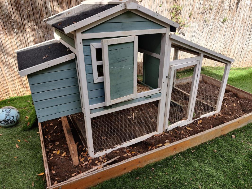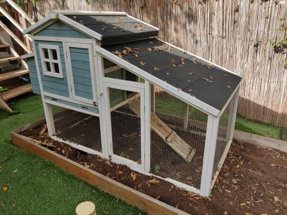 בית לארנבים בנוי מעץ מלא, שתי קומות, מספק להם הגנה ושטח מחייה גדול, מצב מצוין כמעט חדש