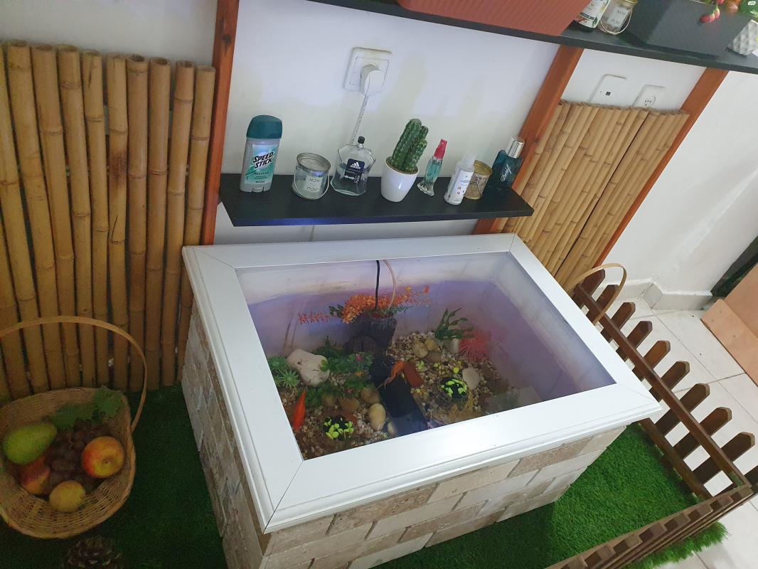 מכירת אקווריום. גודל אקווריום 85cm × 55 cm.גובה סמ 45 אבן טבעית . גודל כללי: 190cm × 85cm. 100cm גובה