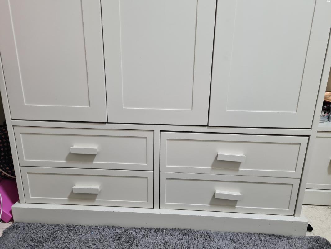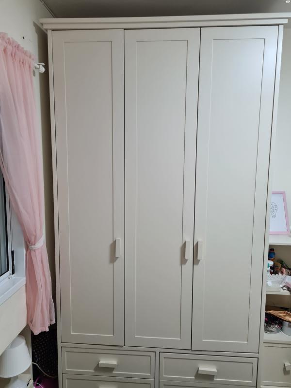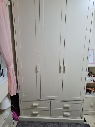 ארון בגדים בגוון אופייט 3 דלתות מעוצב ויוקרתי, מובנה על במה עם סיומת קרניזי, גובה מיוחד 2.65 לתכולה רבה עם חלוקה נוחה להפרדה בין בגדי קיץ לבגדי חורף רוחב 1.40 כולל 4 מגירות רחבות עבור נעליים/משחקים ארון בגדים