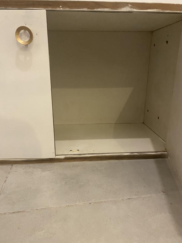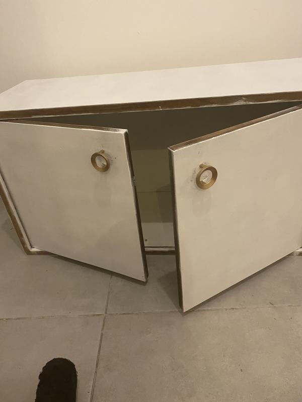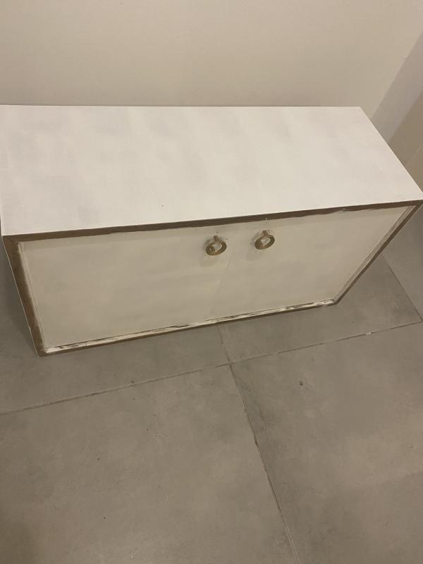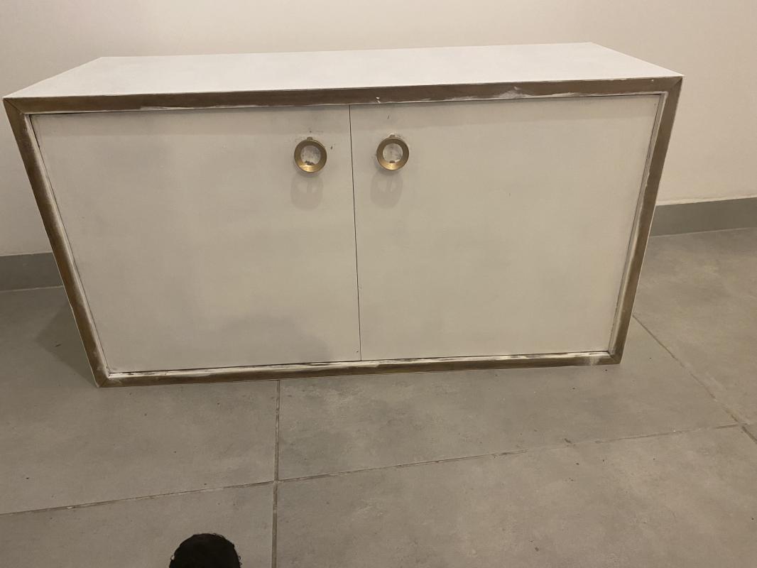 ארון וינטג שנות ה-60 מחודש . צבע לבן חדש ולכה . ידיות בצבע זהב .