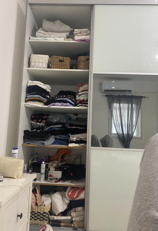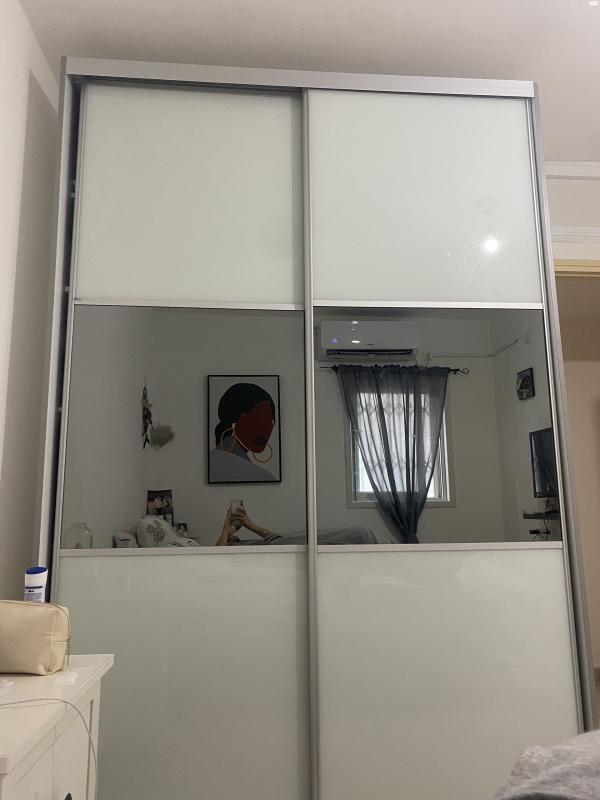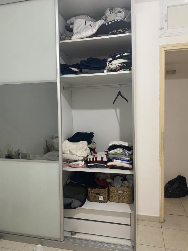 ארון לבן עם מראה באמצע, 2 דלתות הזזה.צד אחד עם תלייה 2 מגירות ומדפים, צד שני מדפים בלבד . 1.20 רוחב , 2.20 גובה . נדרש פירוק, קומה 3 בלי מעלית ארון הזזה 2 דלתות
