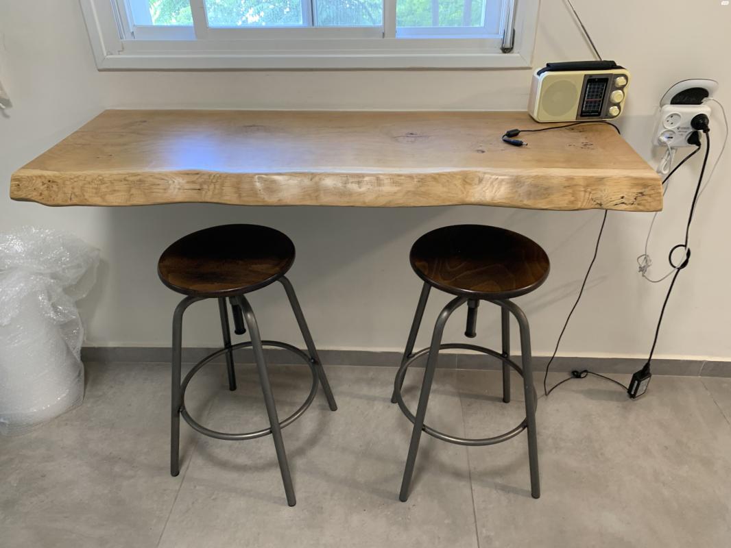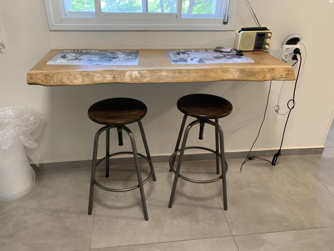 בר מעץ אלון מבוקע 1.30 על 46כסאות חדשים ניתנים להגבהה או הנמכה של המושב בר ישיבה