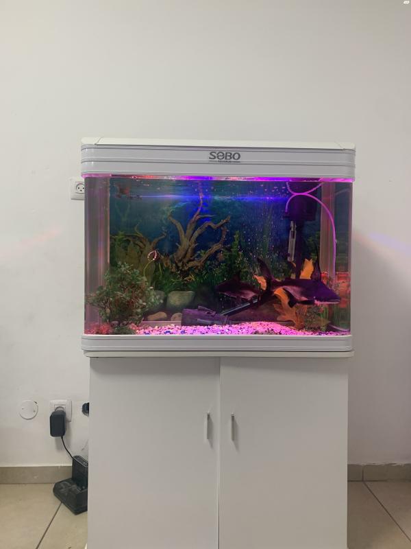 אקווריום+ דגים מסוג טרופי (כריש+תוכי+דג מנקה) אקווריום מרווח וגדול , בנוסף באקווריום מותקן נורות לדים אשר נותנים יופי לאקווריום ולבית :)