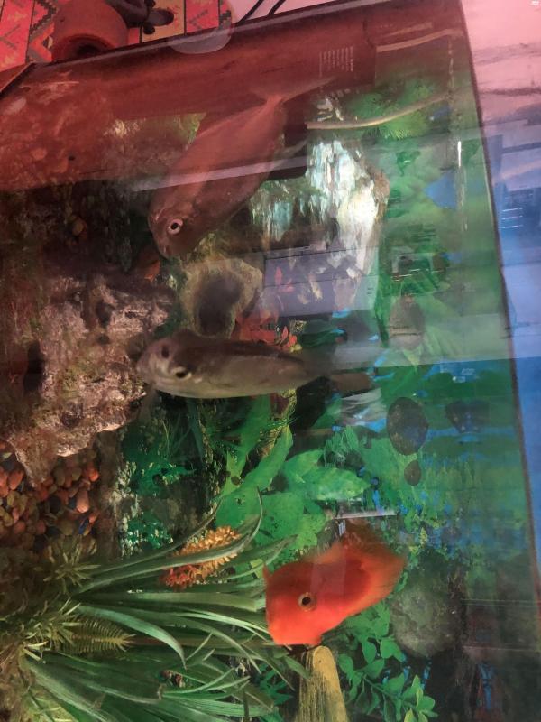 למכירה אקווריום פנורמי קומפלט כולל:משאבת חמצן, חימום , 4 דגים גדולים טורפים+המעמדלא בשבת