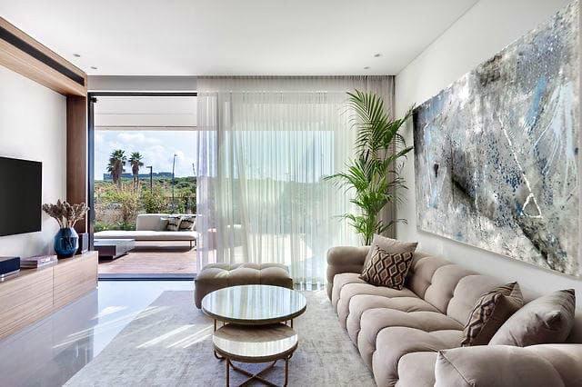 דירת גן מעוצבת אדריכלית מרוהטת ומאובזרת בבניין יוקרתי , במרחק 4 דקות הליכה מהים וממרכז קניות בבניין בריכת שחיה, חדר כושר, 2 חניות ושמירה 24/7