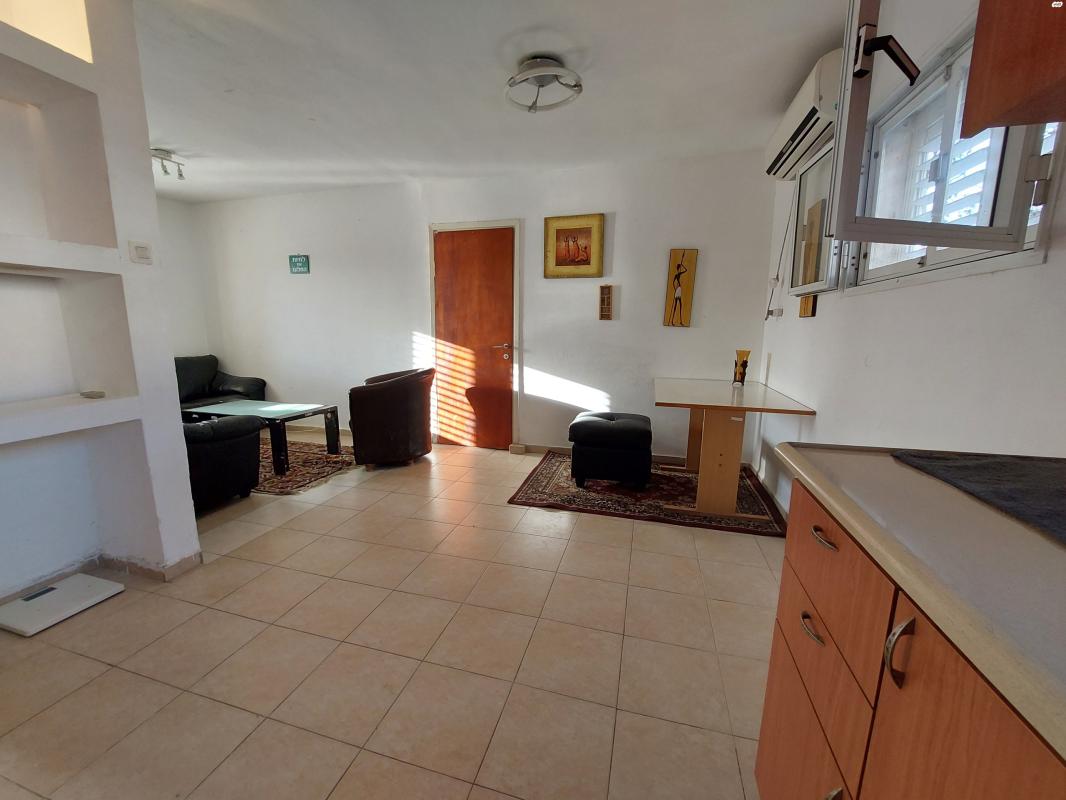 ארונות עליונים, מקרר, שולחן אוכל, מיטה זוגית, כוורת לאחסון. ספה זוגית דמויית עור, כורסה, שטיח ושולחן בסלון