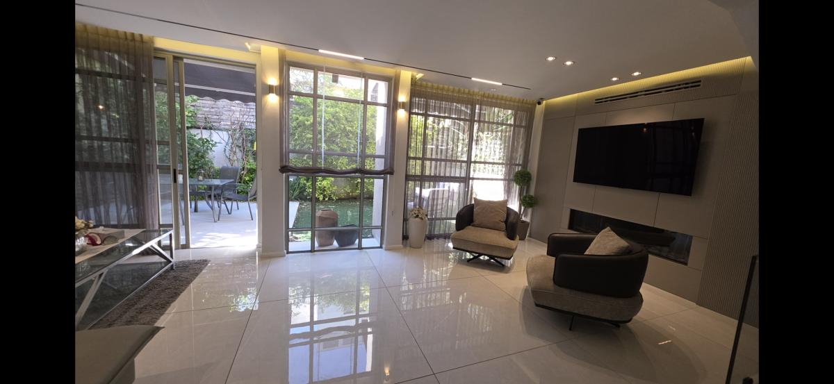 לבית יש מצלמות אבטחה והכנה למטען רכב חשמלי, קיר טלויזיה עם קמין גז של חברת אורטל.