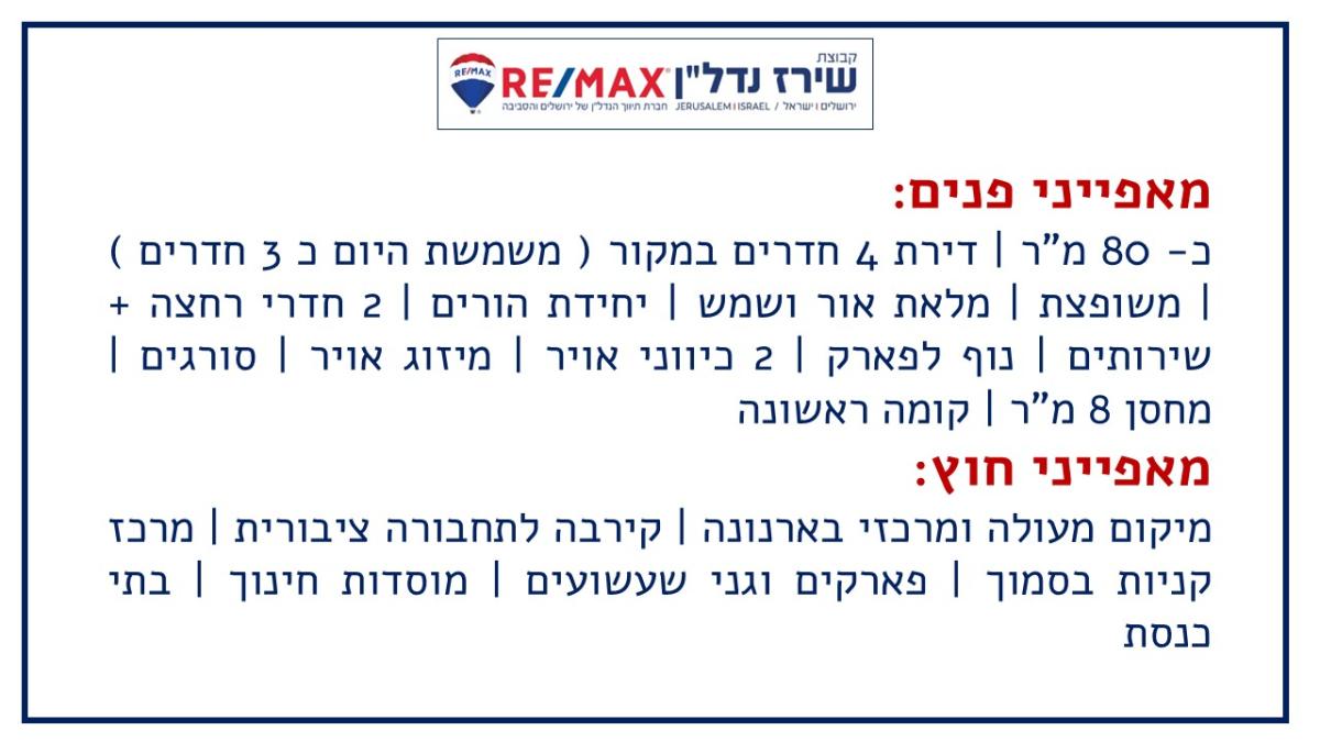 כ- 80 מ"ר | דירת 4 חדרים במקור ( משמשת היום כ 3 חדרים ) | משופצת | מלאת אור ושמש | יחידת הורים | 2 חדרי רחצה + שירותים | נוף לפארק | 2 כיווני אויר | מיזוג אויר | סורגים | מחסן 8 מ"ר | קומה ראשונה