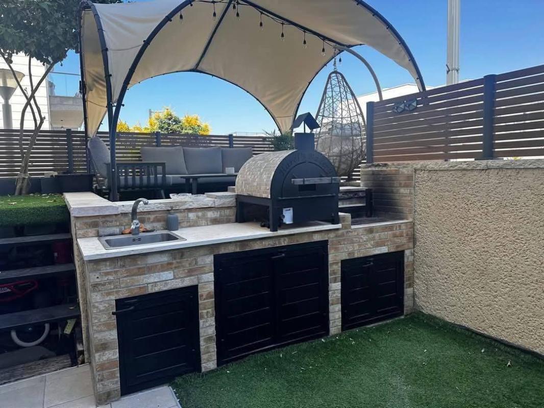 גינה מטופחת עם משטח דשא סינתטי ותאורת גינה, פינת בר בי קיו ומטבח חוץ, מערכת השקיה, נקודת גז חשמל ומים