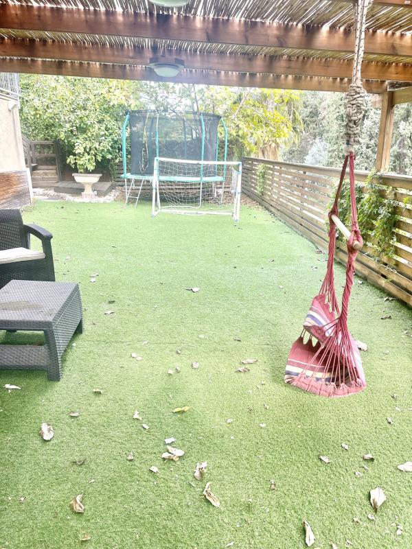 דשא+ דק ופרגולה . דירה משופצת ע״י אדריכלית , מרווחת, מוארת, יחידת הורים גדולה , ממד, 2 שירותים ומקלחות, 2 מחסנים, הגינה פונה ליער, מבודדת ושקטה, מרחק כמה צעדים מבית הספר ומתחבורה ציבורית
