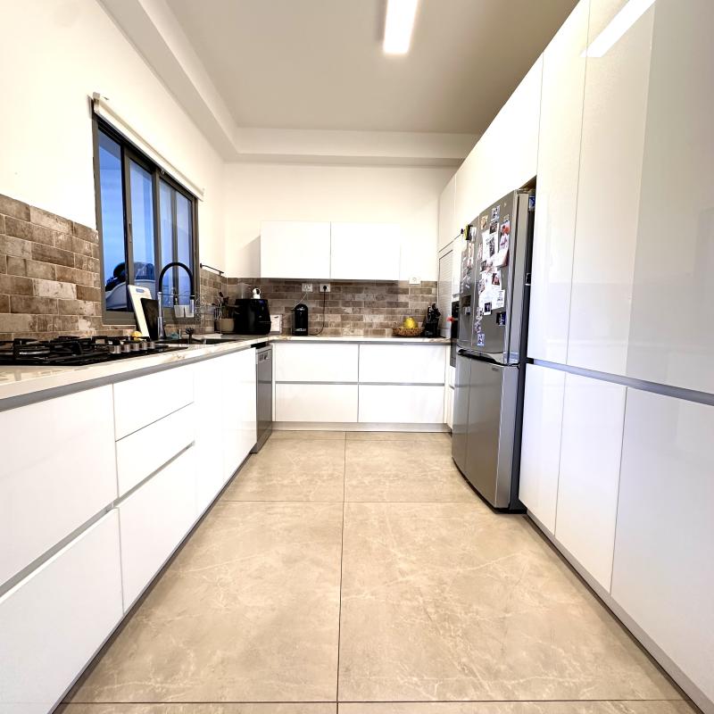 מטבח גדול עם הרבה מקום אחסון, חדרי רחצה משודרגים, תקרות גבוהות .