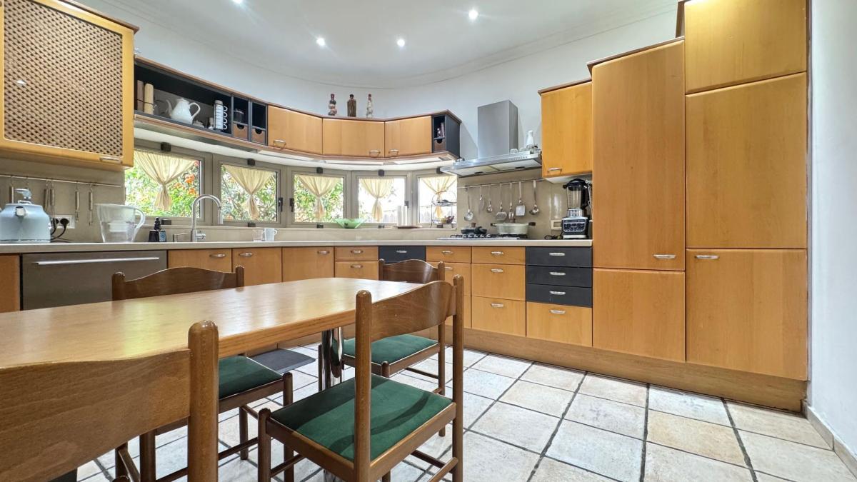 מטבח מרווח עם מזווה גדול צמוד ופינת אוכל.