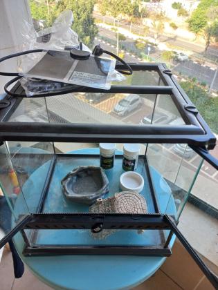 טרריום אקזוטרה קטן, 45 על 45, כולל כלי מים, כלי אוכל, מסתור, שני משטחי חימום, ויטמינים וסידן. ניתן לשלוח הודעה