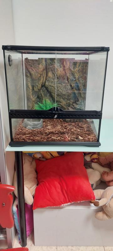 נחש קינג סנייק בן חצי שנה, מהמם ורגועכולל טרריום ופלטת חימום, שקית למצע של שבבי עץ