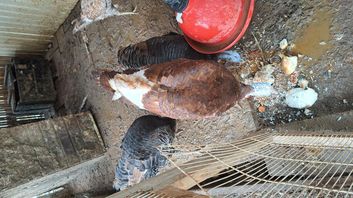 תרנגולי הודו שתי נקבות שחורות וזכר חום, בוגרות שהגיעו להטלה ושתי תרנגולת נקבות.