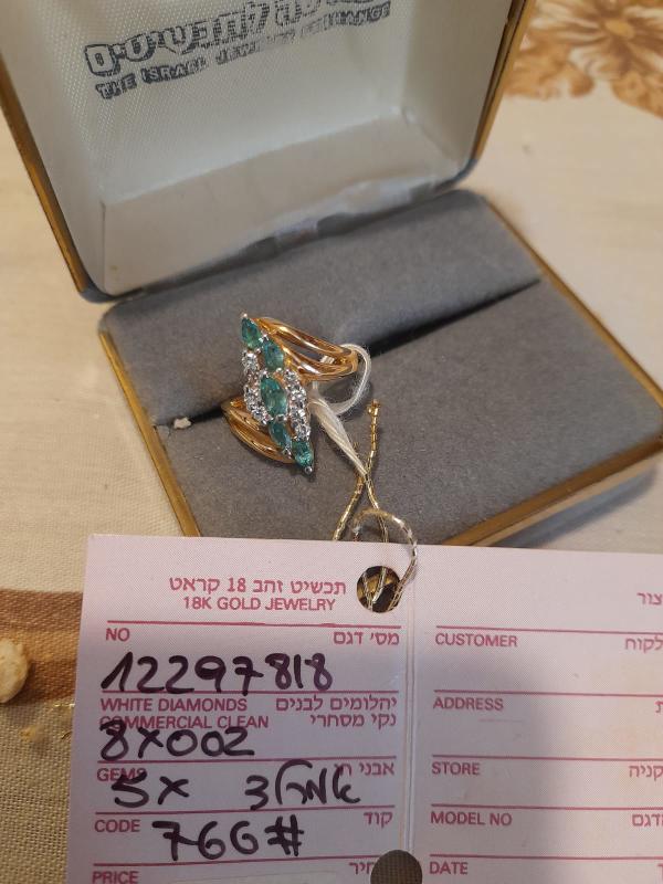 הפירוט המקורי של היצרן מצורף לתמונה של התכשיט. זהב 18 קראט. 8 יהלומים. 5 אבני אמלרד. לא השתמשו בתכשיט אף פעם. עדיין מחובר אליו הפתק המקורי
