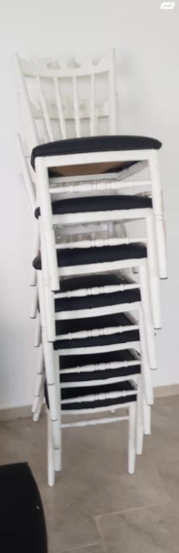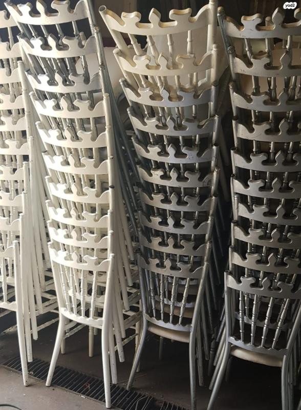 למכירה 100 כסאות יד שניה. הכסאות נערמים. בצבע כסף ולבן. 100 שקל ליחידה. איסוף מירושלים כסאות חגיגיות במצב טוב