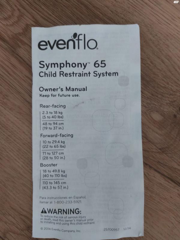 כסא EVENFLO דגם SYMPHONY 65, כמו חדש, אפילו עם מדביקות קנייה ומכברת עם הסברים לשימוש. כסא לילדים עד גיל 8 (עד ~ 40 ק"ג) כסא EVENFLO דגם SYMPHONY 65