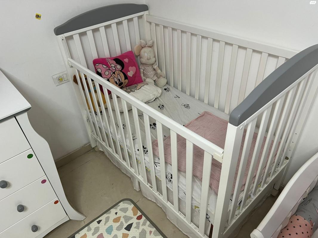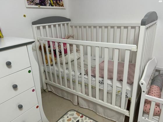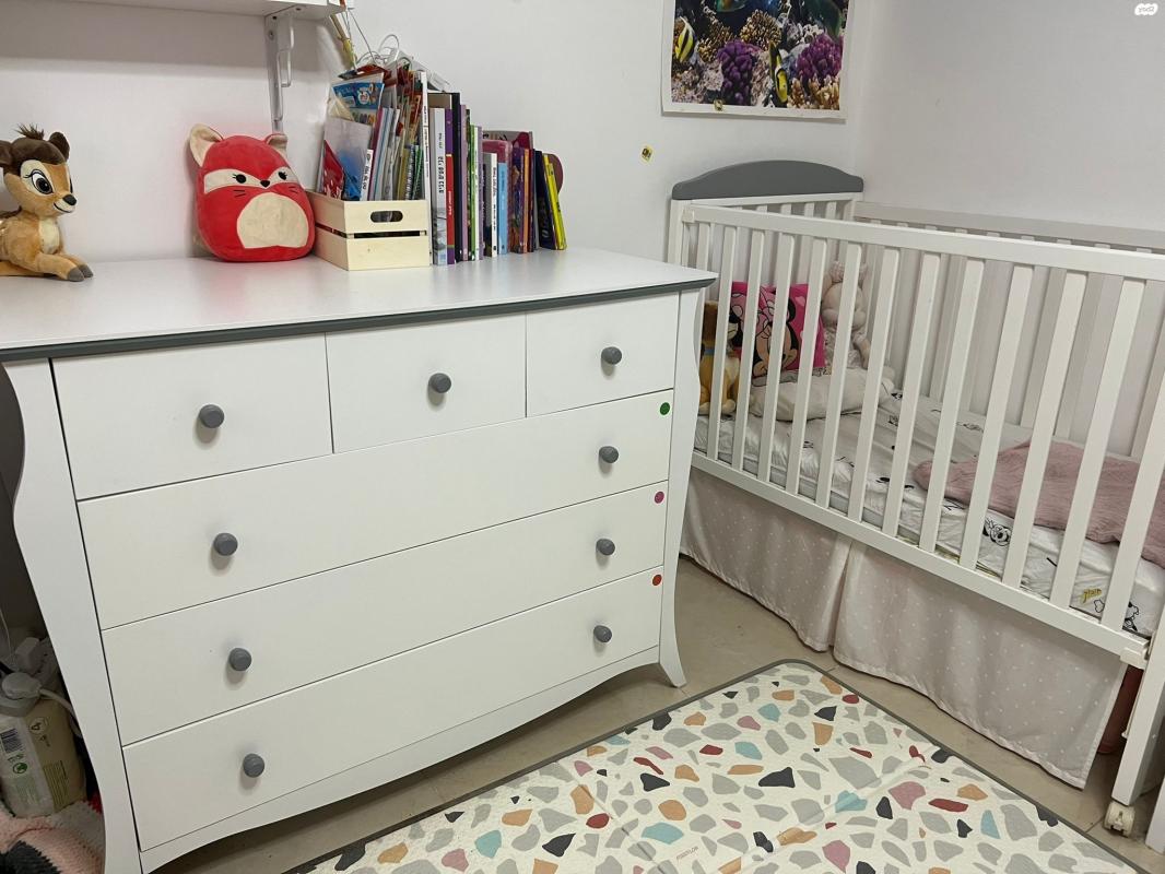חדר תינוקות קומפלט של רהיטי טל מיטה, שידת החתלה ומזרון איכותיהכל שמור מאוד כמו חדששידה גדולה בארוך 120, בצבע לבן ואפור מיטת תינוק ושידרת החתלה