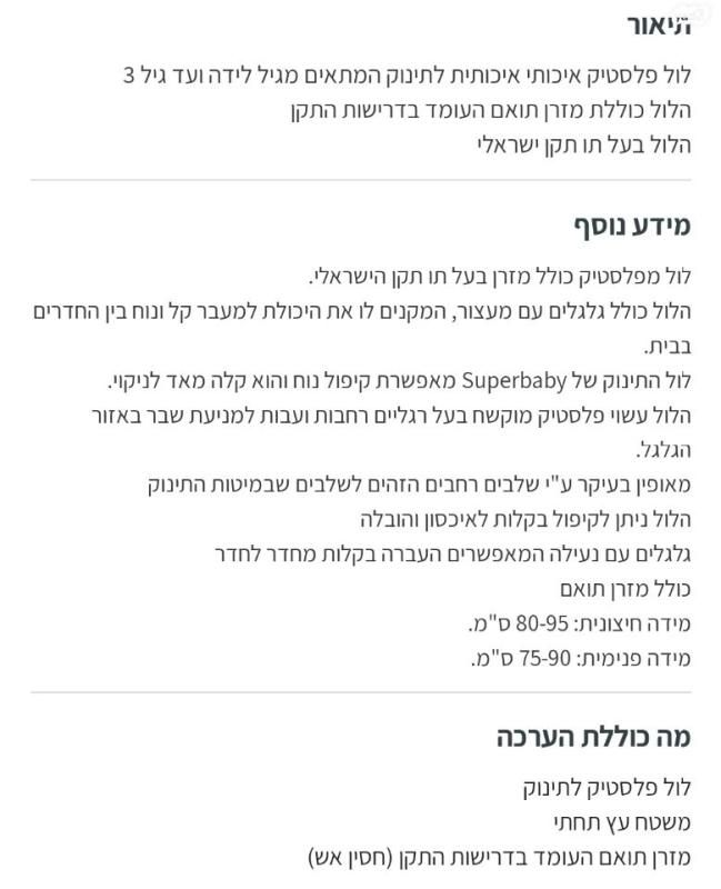 לול פלסטיק פלוס מזרון חדש באריזה הכלול תו תקן צבע לבן..פינוי קומת קרקע לול מפלסטיק כולל מזרון חדש