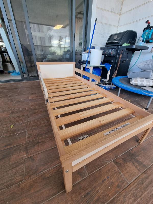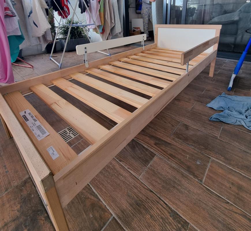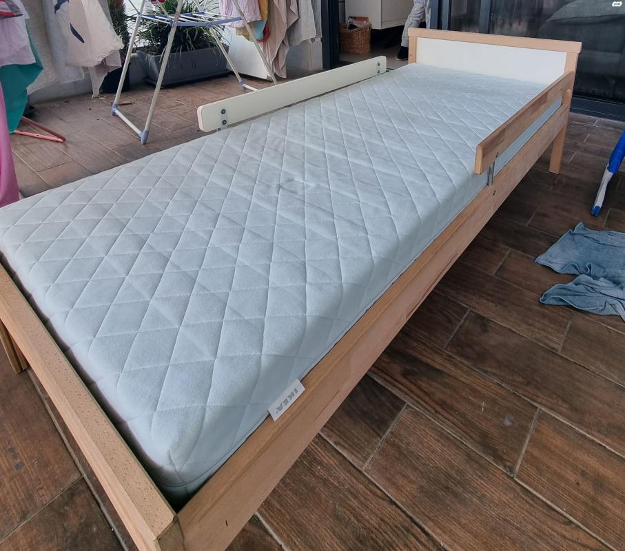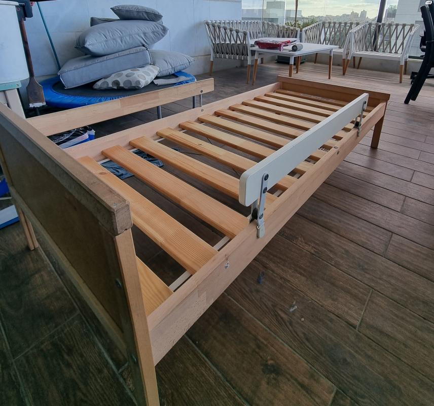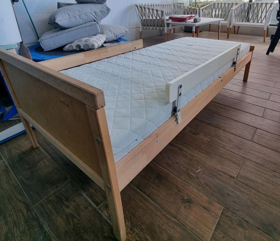 מיטת מעבר של איקאה. 160×70 ס"מ כולל תוספת של מעקה בטיחות ומזרון במצב מעולה. מחיר סט חדש 629 ש"ח! מיטת מעבר מעץ מלא + מזרון