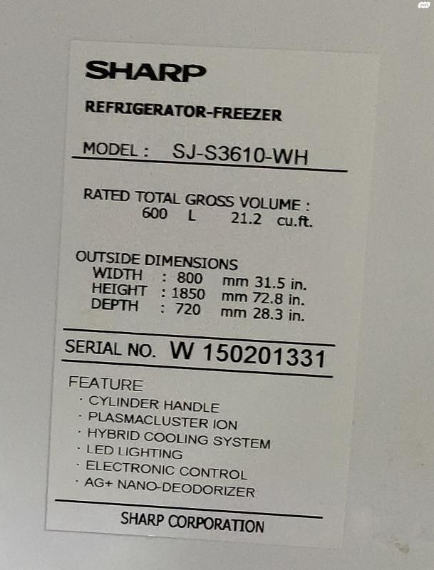 מקרר שארפ דגם - SJ-S3610-WH,מערכת קירור היברידית, Plasmacluster משודרגת, מגירת צינון PCI, תאורת LED פנימית, מערכת ננו להפגת ריחות, ידיות צילינדר אנכיות ארוכות, צבע לבן - SHARP מהדרין, במצב חדש מקרר SHARP כשר מהדרין