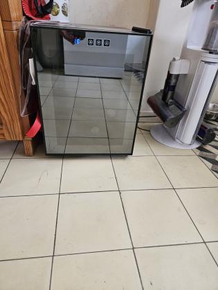 בקרר יינות שחור עם דלת מראה במצב מעולה מקרר יינות