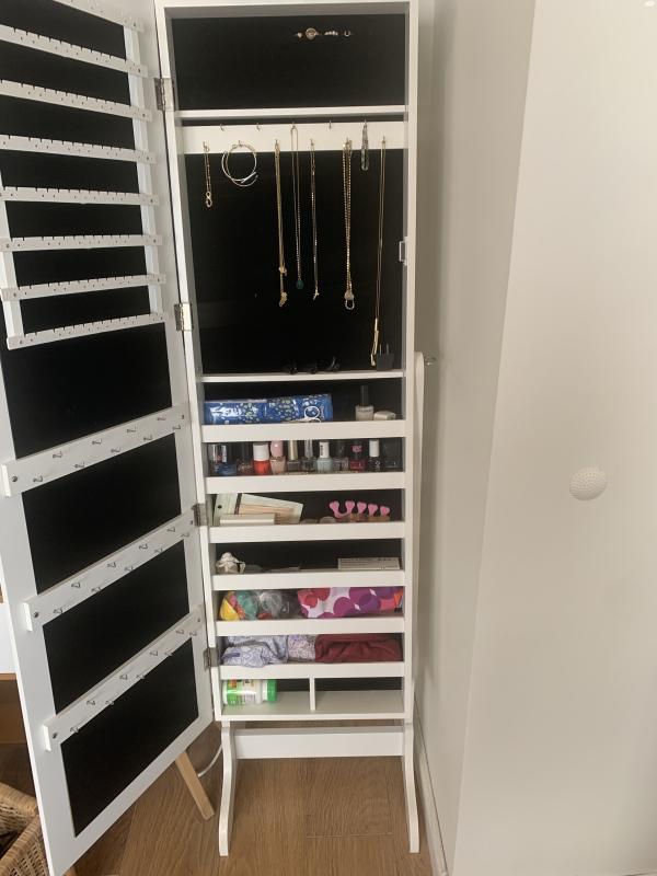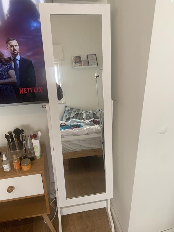 מראה עומדת במצב טוב! קיימת מסגרת מעץ בצבע לבן שנפתחת לארון תכשיטים בעל חריצים לטבעות, וויי תליה לשרשראות וצמידים וגם מדפונים שיכולים לאחסן פריטים רבים.גובה 155 רוחב 16.מוכרת עקב מעבר דירה מראה נפתחת לארון תכשיטים