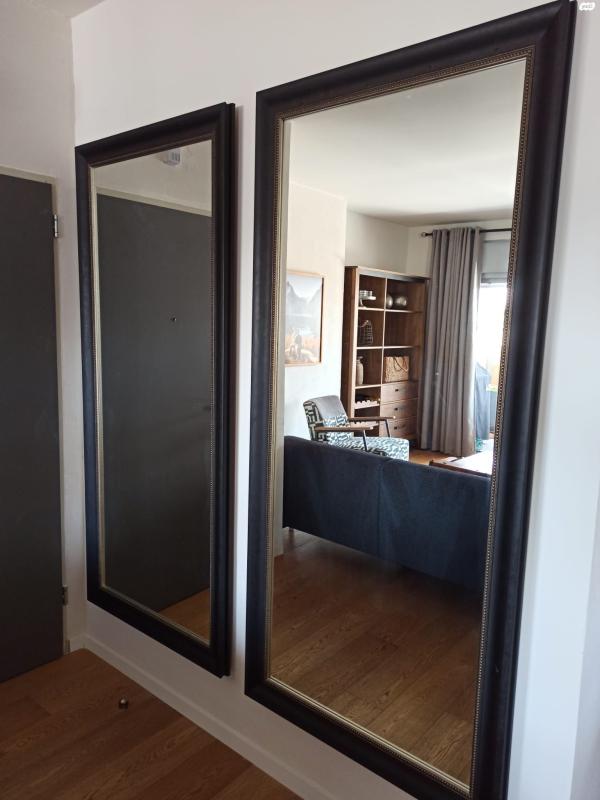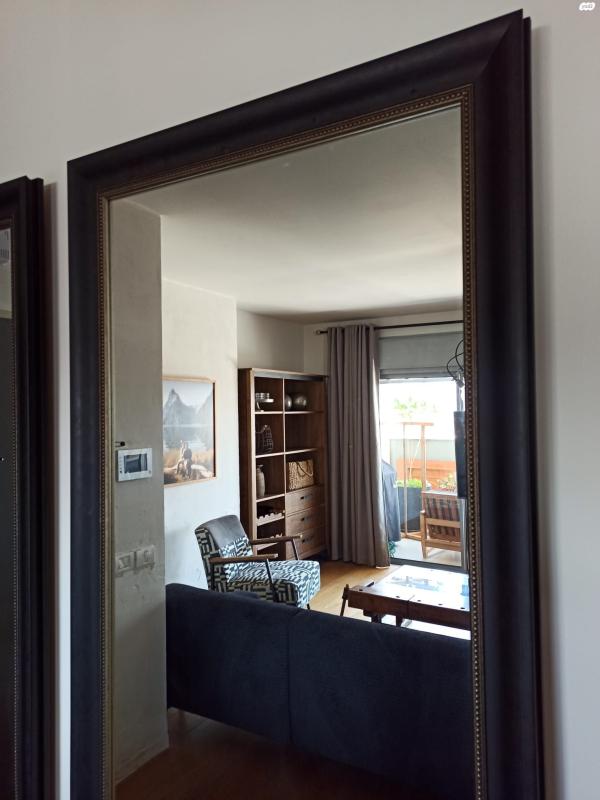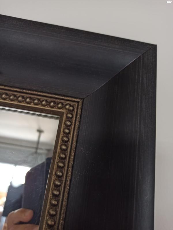 2 מראות גדולות. חדשות. יוצרו ע"פ הזמנת מעצב ב"סיפור מסגרת". מידות: 87.5 ס"מ רוחב על 193 ס"מ אורך. עובי המסגרת 8 ס"מ. המסגרת בצבע שחור מיושן עם עיטורי נקודות מוזהבות. המסגרת "צפה" 2 ס"מ מהקיר באמצעות מסגרת מוסתרת פנימית המרחיקה אותה מן הקיר ומקנה לה מראה מיוחד של ניתוק. באזור הניתוק ניתן להוסיף פס לדים כך שמאחורי המראה תהיה תאורה עדינה (אפילו צבעונית). המחיר לאחת. ניתן לקנות את שתיהן מראה גדולה מעוצבת
