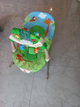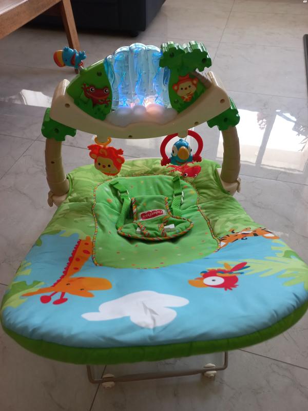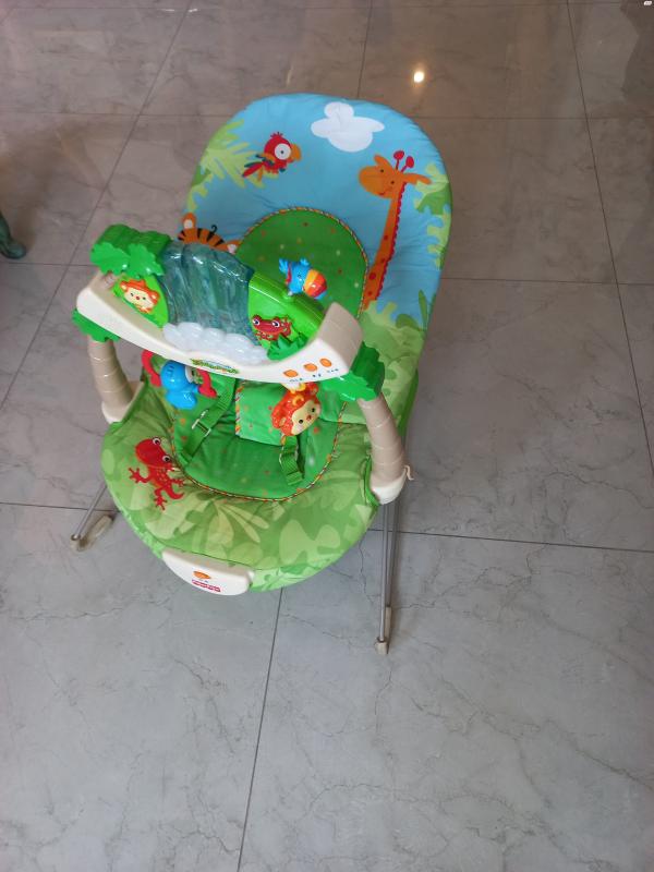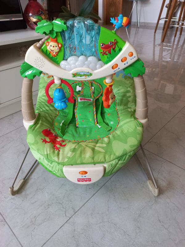 טרמפולינה, יער הגשם, פישר פרייס, עד 9 ק"ג. במצב טוב מאוד, פועל ותקין. משמשת ככיסא נוח לתינוק ותומכת בגופו בצורה אנטומית מושלמת. שימושית מאד להאכלה מבקבוק ומכפית. מצויידת בפעלולון אלקטרוני מפואר. מקושט בחיות ואלמנטים נוספים תלויים טרמפולינה, יער הגשם, פישר פריי