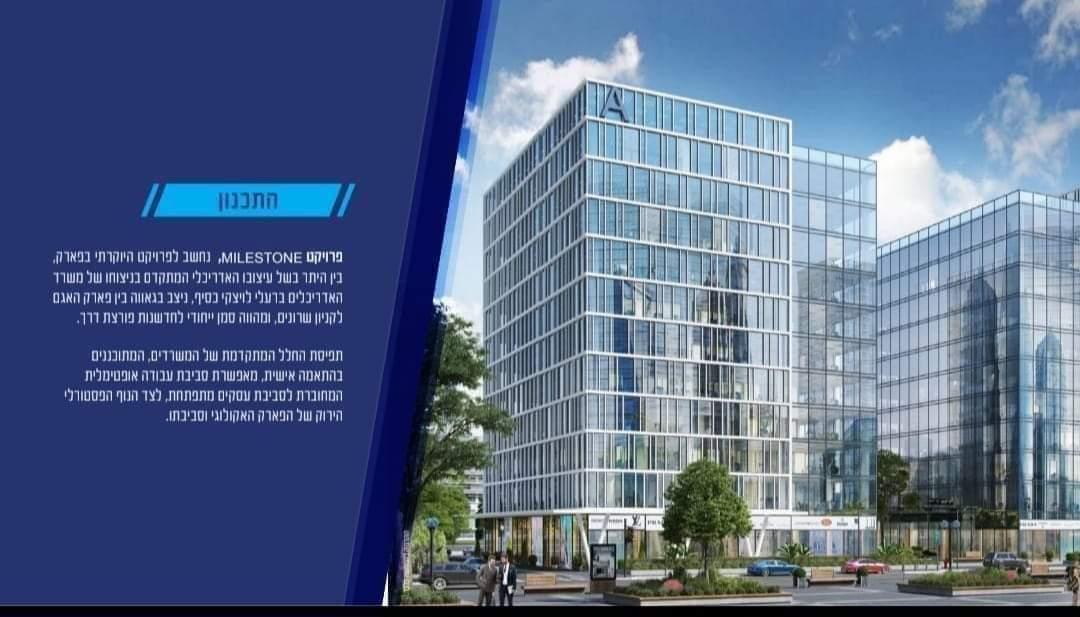 בפרוייקט מיילסטון היוקרתי למכירה משרד כ203 מ3 חניות בטאבומחסןממ"דתנאי תשלום נוחים