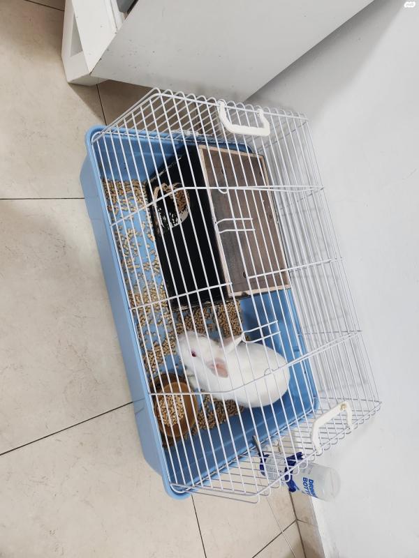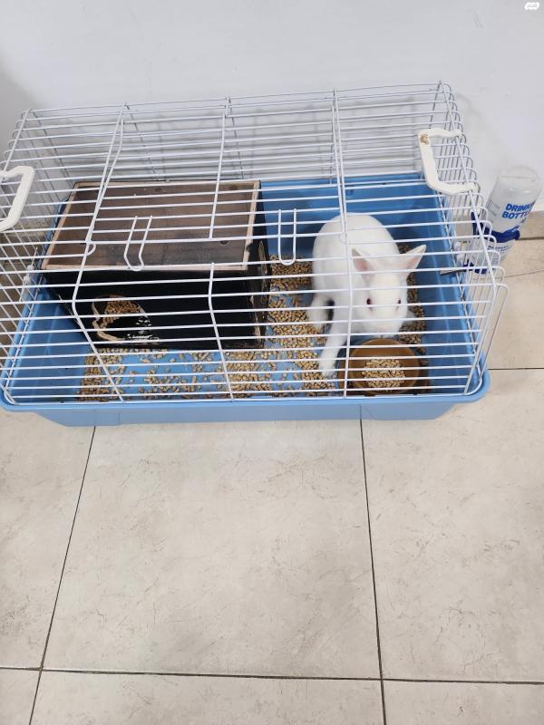 ארנב ננסי מעורב ומטופח. מגיע עם כלוב גדול, בית מעץ , קערת אוכל ובקבוק מיוחד