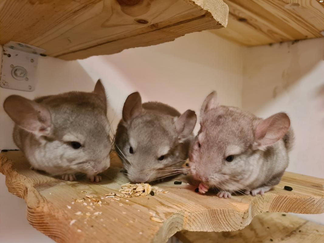 גורי צינצילה מתוקים ממש ומורגלים, בני שלושה חודשים, אחד אפור בהיר ושניים אפור כהה