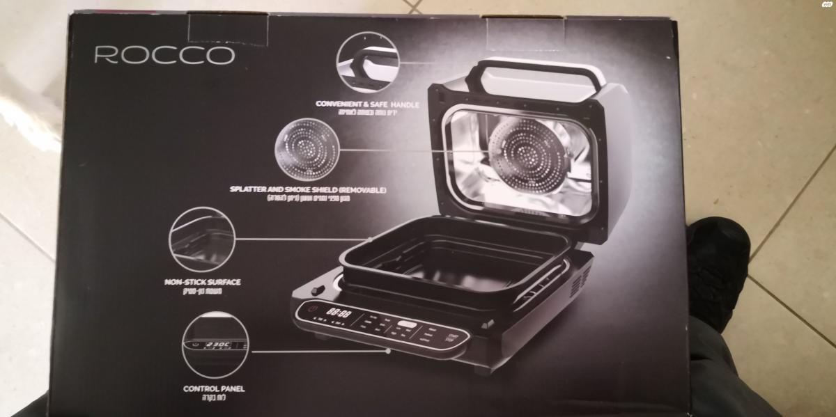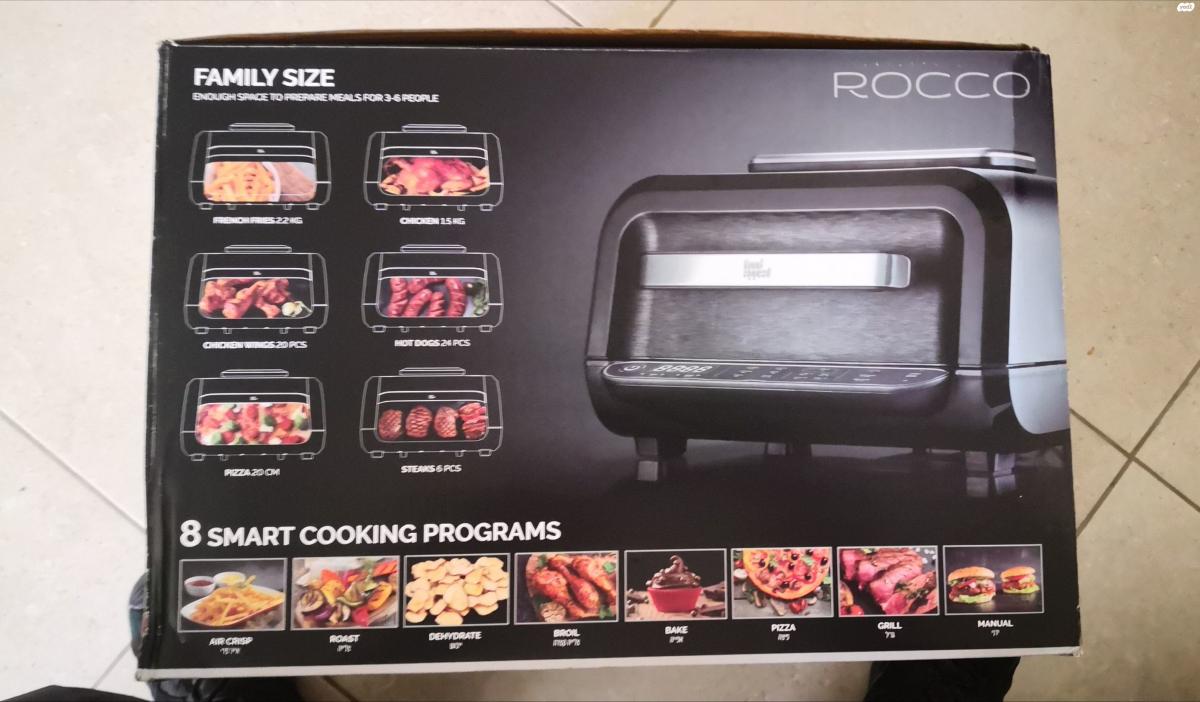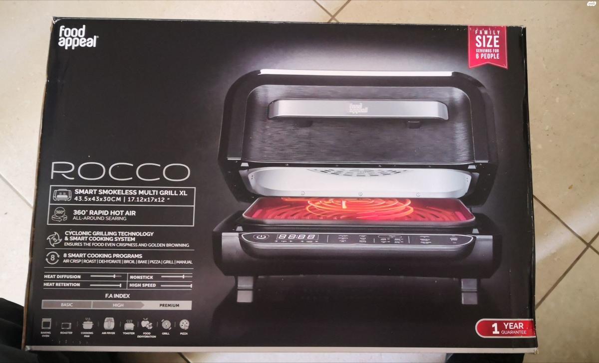 בהזדמנות חד פעמית גריל חשמלי ביתי ללא עשן חדש באריזתו המקורית. 7 פעולות במכשיר אחד--צלייה,אפייה,טיגון,טיגון אוויר,ייבוש,לא נפתח. עם חוברת מתכונים. לוח לחצנים בעברית. גריל ROCCO XL מבית פוד אפיל דגם FN660 pro. גודל 33*48*48 גריל חשמלי ללא עשן של פוד אפיל
