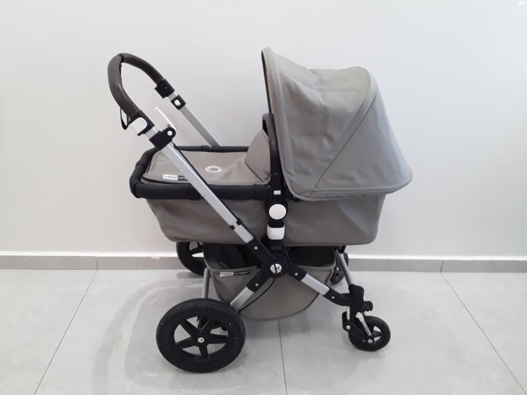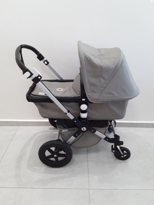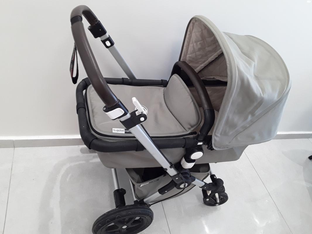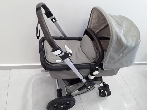 עגלת בוגבו קמיליון 3 בצבע ירוק מעושן צבע שמנת פנימי, במצב מצוין שכיבה +טיולון ידית ופגוז' מעור חום כולל מזרון לטיולון + נילון לגשם עגלת בוגבו קמיליון 3 בצבע ירוק