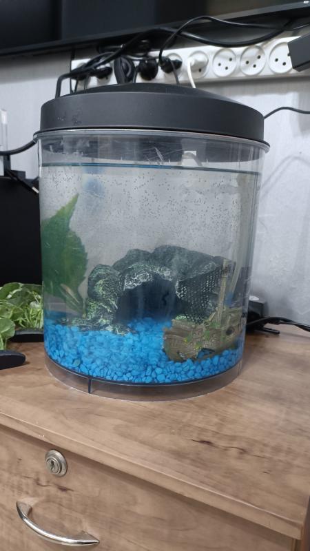 אקווריום עגול קטן 25 ס"מ על 25 ס"מ.מגיע עם פילטר אוויר, חצץ, מנהרה, אוניה.יש נורת לד מובנת במכסה אבל נשפרה.יש אפשרות לשים חדשה וזה עולה 100₪.לעוד פרטים ניתן להתקשר