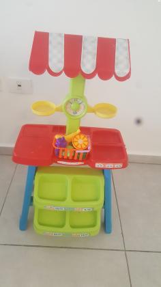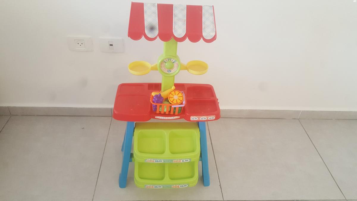 דוכן שוק עם משקל וסלסלה עם פירות דוכן שוק