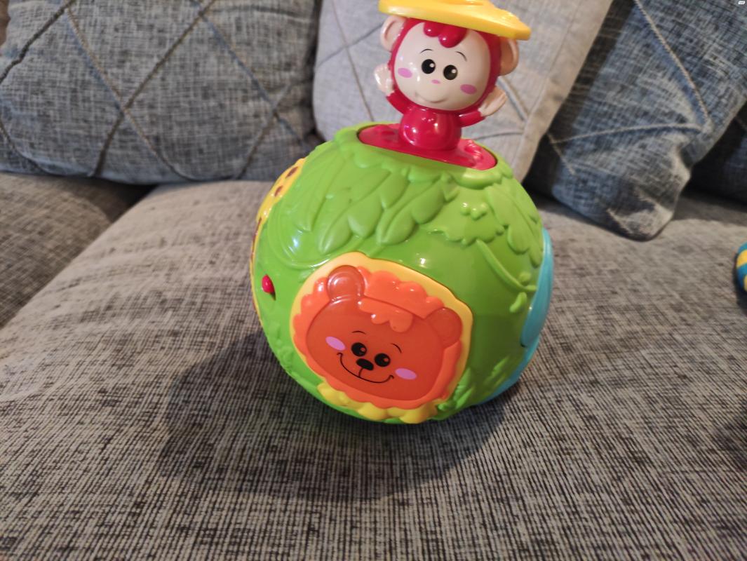 כדור מעודד זחילה במצב כמו חדש מנגן ומאיר עם כל מיני חלקים תחושתיים,עם קוף שיוצא מן הכדור בלחיצה על אחד הכפתורים כדור מעודד זחילה