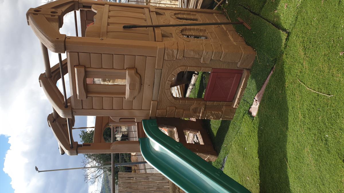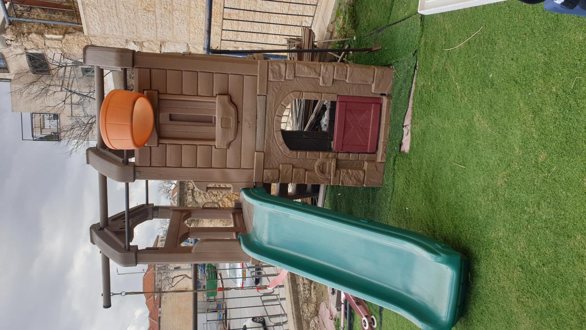 מתקן חצר לילדים בית עם מגלשה. נדנדה וכדורסל. חזק ואיכותי