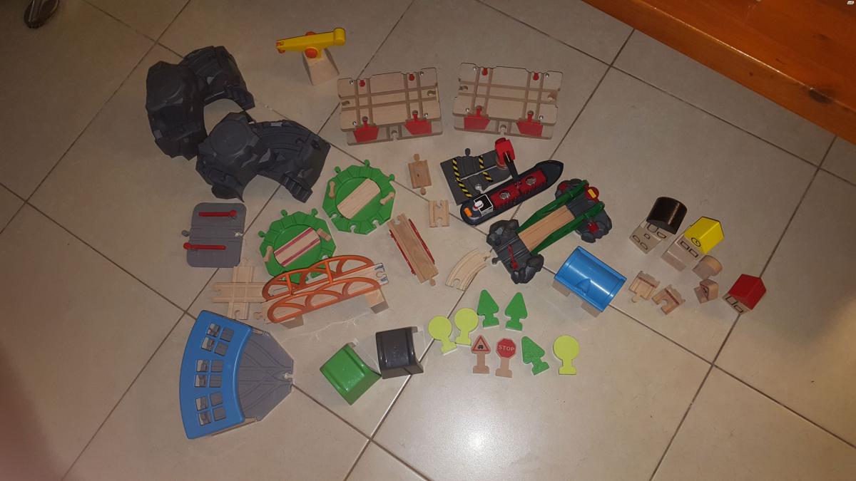 פסי רכבת מעץ של איקאה וגם של בריו כולל 2 קטרים ממונעים וקרונות, גשרים, צמתים, תחנות ועוד - כל מה שמופיע בתמונות. כמות חלקי עץ מופיע בתמונה. הכל כולל קופסאת פלסטיק לאחסון 300 שח פסי רכבת איקאה + בריו