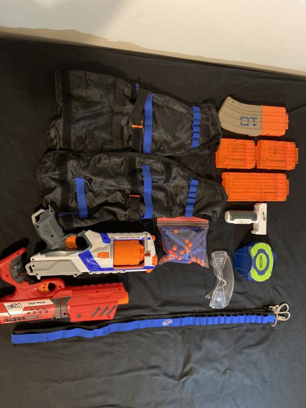 רובה נרף עם מחסנית של 6 חצים מגיע עם 27 חצים, ארבע מחסניות, אפוד מגן, חגורת נרף, ידית אחיזה שאפשר לחבר לרובה, מטרה, משקפי מגן ורובה נוסף של כדורים שמתנפחים במים ושמים במחסנית של הרובה רובי נרף חצים ועוד הרבה דברים