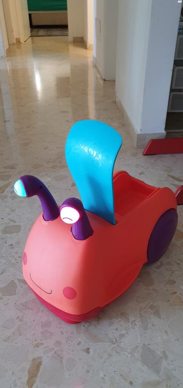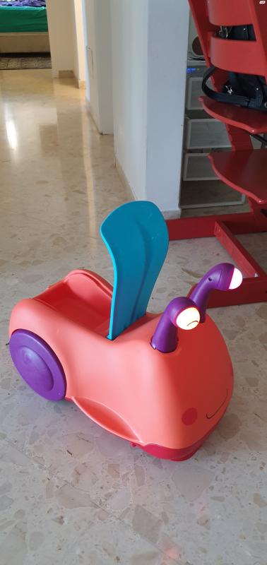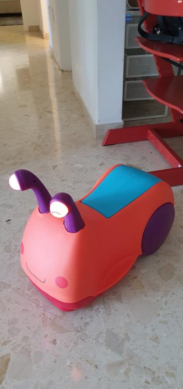 בימבה בעיצוב של חילזון עם מחושים שמשמשים כידיות אחיזה.כשלוחצים על המחושים הם מאירים ומצפצפיםלבימבה כסא ארגונומי שמאפשר ישיבה נוחה. אפשר להרים את המושב ולגלות את מיכל האחסון שמסתתר תחתיו.מתאים לגיל : 1-3 שנים בימבה חילזון בטאט