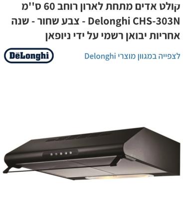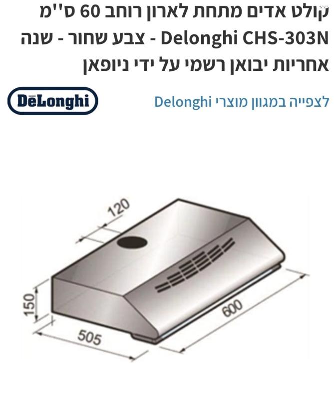 קולט אדים חדש באריזה של חברת delonghi דגם 303n בצבע שחור,רוחב 60 ס"מ.שנה אחריות.נימכר עקב אי התאמה במידות קולט אדים חדש באריזה