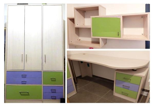 חדר ילדים / נוער נרכש מחב' עצמלה, מעץ סנדוויץ', מצב שמור, כולל :ארון בגדים 3 דלתות עם תלייה, גובה 260 ס"מ רוחב 140 ס"משולחן כתיבה מעוגל עם 3 מגירות ורגל ניקל ) ניתן לקבע לקיר)כוורת /כוננית עם דלת חדר שינה ילדים קומפלט (עצמלה)